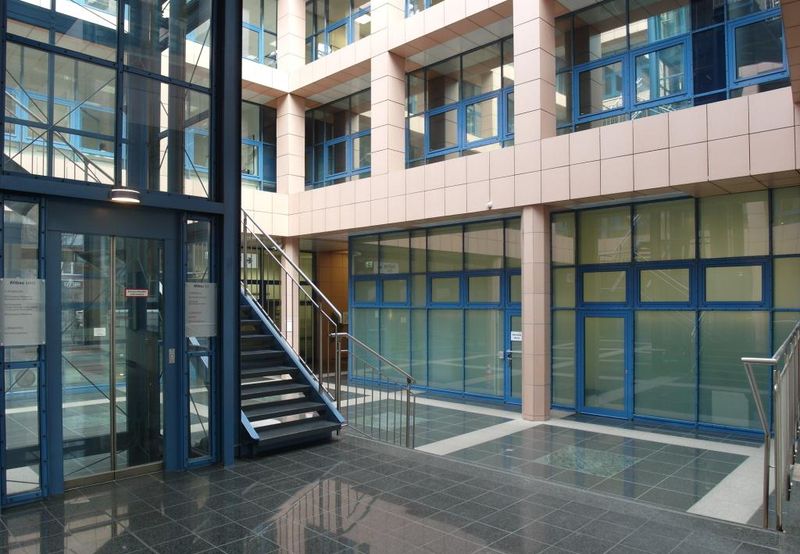 Über den repräsentativen Eingangsbereich mit Säulen, großen Sprossenfenstern mit Rundbögen und hochwertigen Steinböden gelangt man direkt in das großzügige Atrium, welches zum Verweilen einlädt. Hier befinden sich neben einem Pförtnerbüro auch Sitzmöglichkeiten.