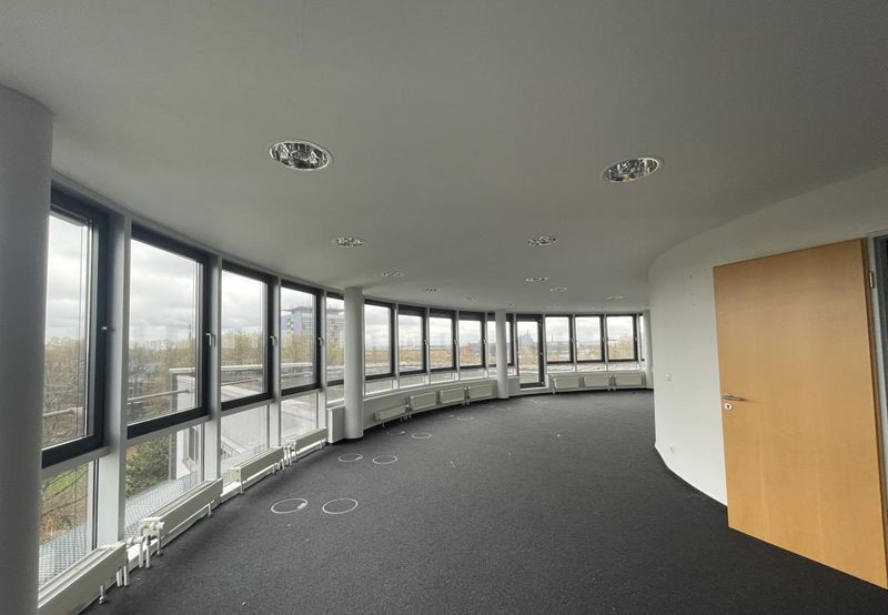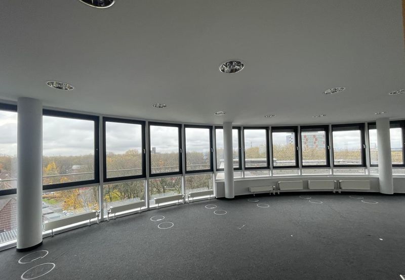 Die Büroflächen bestechen durch große und viele Fenster, welche eine helle und optimale Arbeitsatmosphäre schaffen. Durch die runde Bauweise des Objektes hat man einen großartigen Ausblick über Oberhausen.