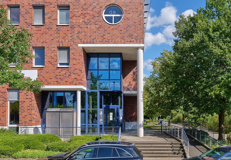 Eine moderne Außenfassade mit Ziegel-, Stahl und Glaselementen sowie ein repräsentatives Foyer mit Drehtür und separatem Behinderteneingang machen das Objekt zu einem Standort mit Qualität.
