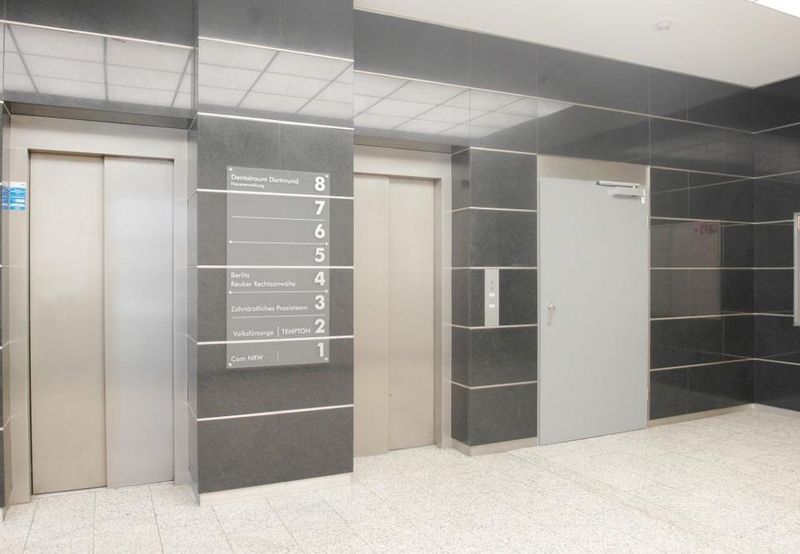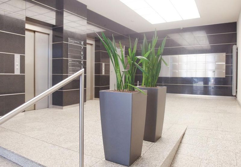 Über den im Jahre 2007 neu gestalteten repräsentativen Eingangsbereich gelangt man zum Treppenhaus und den beiden Personenaufzügen.