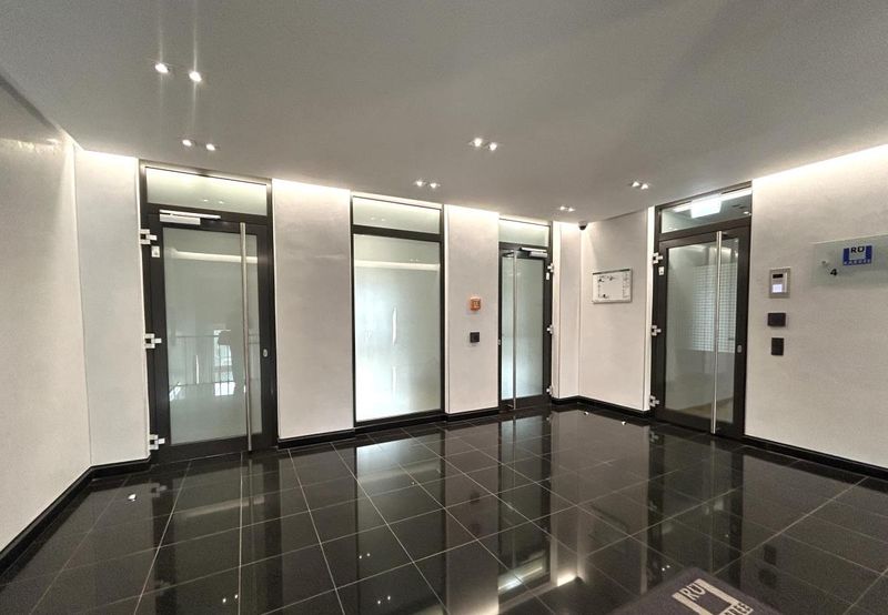 Alle Eingänge sowie der Ein- und Ausfahrtbereich des Innenhofes sind mit Video- und Sprechanlagen ausgestattet. Der Haupteingang beeindruckt durch seine historische Sandsteinfassade, die mit Elementen aus Stahl und Glas kombiniert wurde. Die sensible und gelungene Mischung aus traditionellen und modernen Bauelementen setzt sich im Foyer konsequent fort. Auch alle weiteren Eingänge des Rü-Karrees, die im Rahmen der Kernsanierung völlig neu erstellt und mit modernen Treppenhäusern und Fahrstuhlanlagen versehen wurden, vermitteln einen repräsentativen Eindruck. Aufwendige Beschilderungssysteme aus Glas- und Stahlelementen garantieren die gute Orientierung vor Ort.