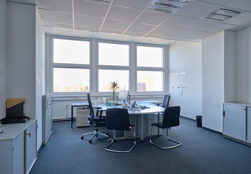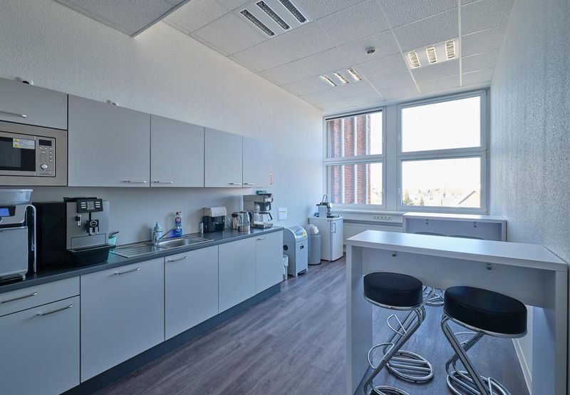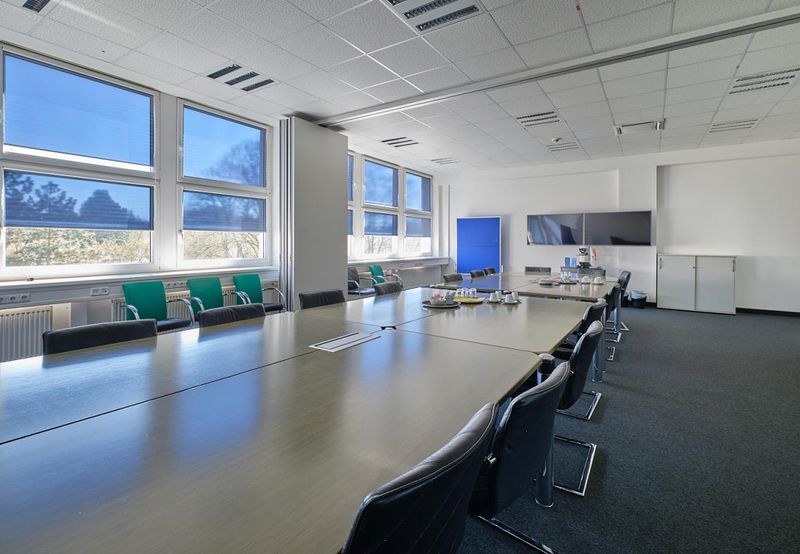 Durch die großen Fenster wird eine sehr helle und freundliche Arbeitsatmosphäre in den modernen Büros geschaffen. Ein großzügiger Eingangsbereich bietet Platz für einen Empfangs-/Loungebereich. Das Highlight der Fläche bietet der große Besprecher, welcher durch eine mobile Trennwand geteilt werden kann.