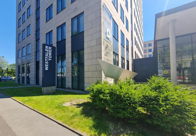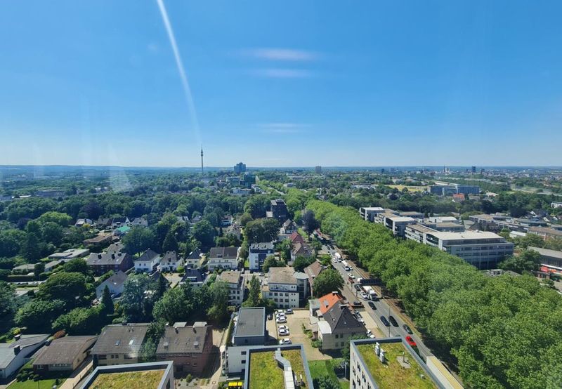 In dem dreiteiligen Gebäudeensemble fungiert der 22-geschossige „Tower“ mit solitärem Charakter als Landmarke direkt am Standeingang. In westlicher Richtung schließt das viergeschossige U-förmige „Atrium“ an, im Süden das L-förmige „Forum“ mit sechs Geschossen. Beide sind über die repräsentative Eingangshalle mit dem „Tower“ verbunden. Ihre Kunden erreichen von der objekteigenen Tiefgarage bequem mit dem Glasaufzug den besetzten Empfang. Von dort aus geht es in die 17te Etage mit -traumhaften Ausblick über ganz Dortmund!