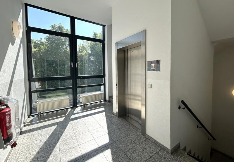 Das 4-geschossige massiv konventionell erbaute Haus wird über helles Treppenhaus erschlossen. Zusätzlich ist ein Fluchttreppenhaus an der Gebäudeseite angebracht. Der ebenerdige Zugang ist über einen Fahrstuhl im Haupttreppenhaus gesichert, der die einzelnen Etagen erschließt. Die Etagen sind jeweils mit einer OWA-Abhangdecke ausgestattet, die Verkabelung erfolgt über Brüstungskanäle.