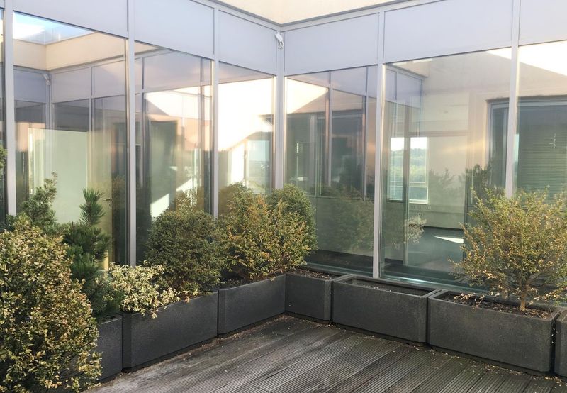 Im 5. Obergeschoss befindet sich mit einer großzügigen Dachterrasse das Highlight des Gebäudes. Auch der ansprechend gestaltete Außenbereich mit begrünten Flächen und vorhandenen Außenstellplätzen machen dieses Objekt besonders attraktiv für den zukünftigen Mieter. Zusätzlich zu den Außenstellplätzen besteht die Möglichkeit, Parkflächen in der hauseigenen Tiefgarage anzumieten. Das 4. Obergeschoss eignet sich hervorragend für Open-Space.