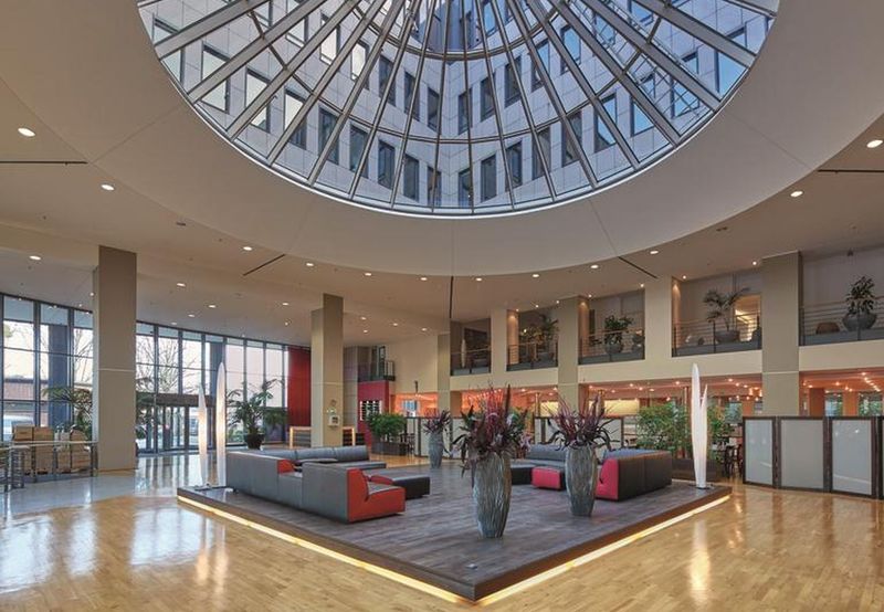 Das repräsentative Foyer erstreckt sich über zwei Etagen und bietet den Mietern eine serviceorientierte Cafeteria mit abwechslungsreichem Angebot.