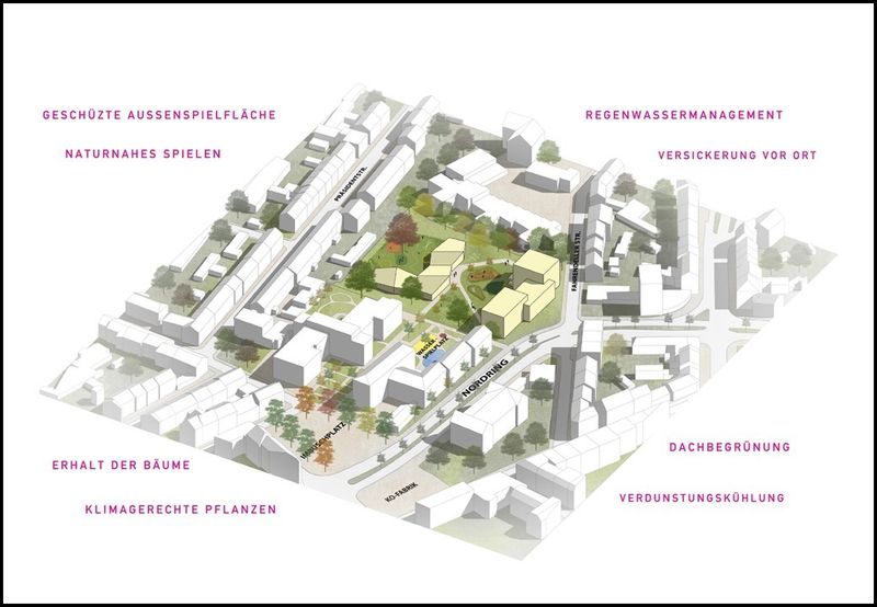 Zudem entsteht im inneren Bereich des Grundstücks eine Kindertagesstätte aus Massivholzkonstruktion für ungefähr 95 Kinder. Durch die neu gestalteten Grün-/Außenanlagen entsteht aus dem bereits Bestehenden ein grüner Campus in zentraler Lage von Bochum.