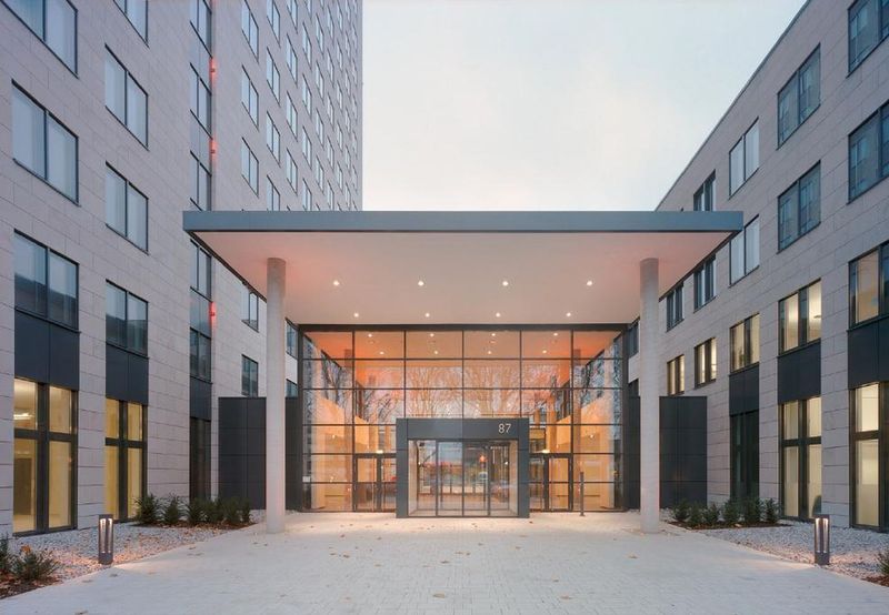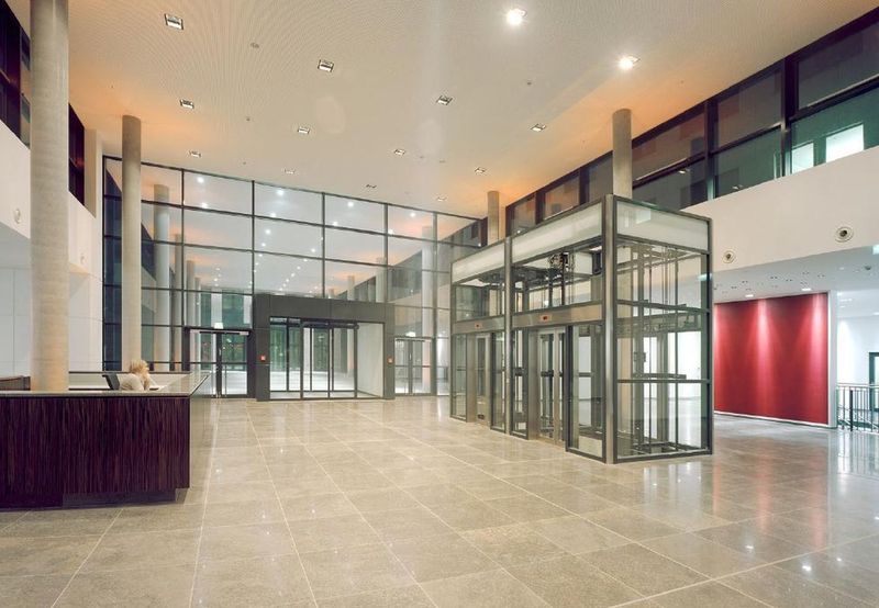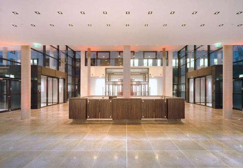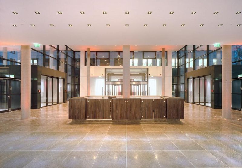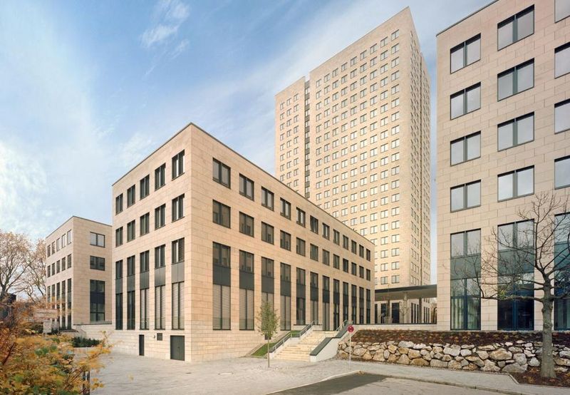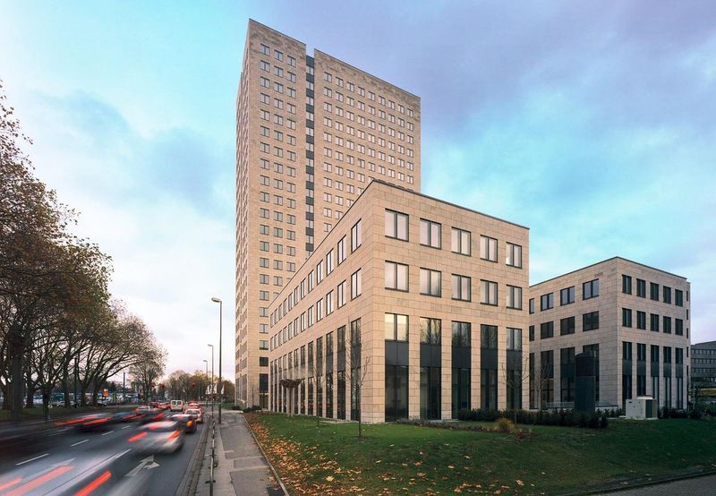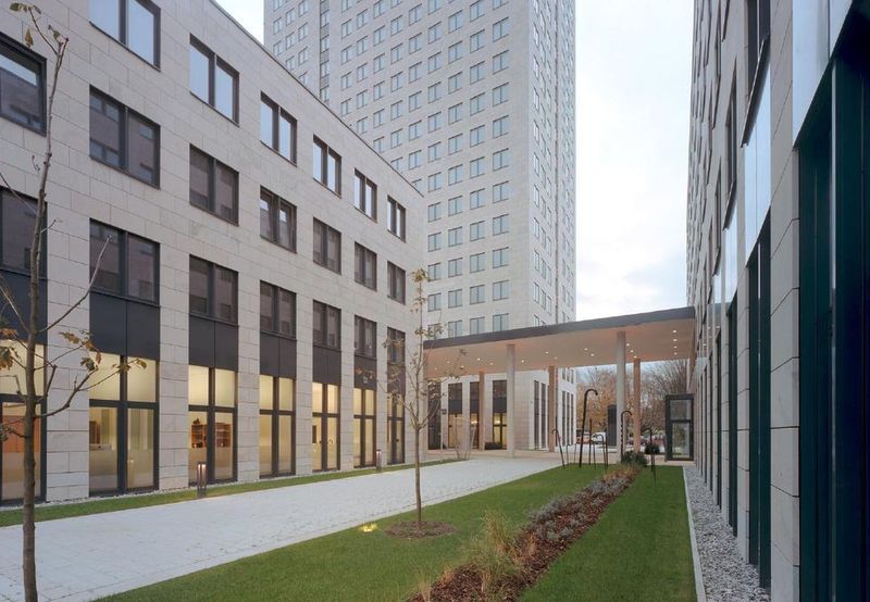 In dem dreiteiligen Gebäudeensemble fungiert der 22-geschossige „Tower“ mit solitärem Charakter als Landmarke direkt am Standeingang. In westlicher Richtung schließt das viergeschossige U-förmige „Atrium“ an, im Süden das L-förmige „Forum“ mit sechs Geschossen. Beide sind über die repräsentative Eingangshalle mit dem „Tower“ verbunden. Ihre Kunden erreichen von der objekteigenen Tiefgarage (452 Stellplätze) bequem mit dem Glasaufzug den besetzten Empfang.